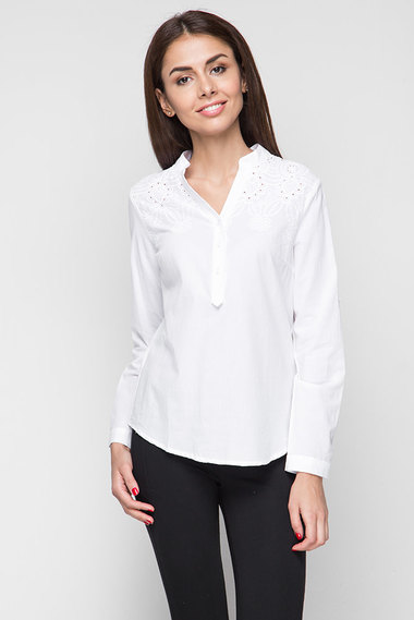 Нежная блузка с длинными рукавами. Модель из 100% хлопка, с аккуратным воротом "стойкой"  и кружевными вставками на плечах.